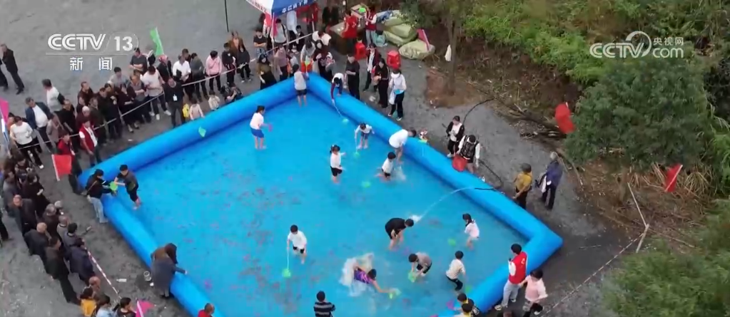 在捕魚現場,當地還設立了捕魚體驗區,大人們協力拉緊繩索收攏大網,體驗豐收的喜悅;小朋友們也擼起袖子,挽起褲腿用網撈魚,沉浸式體驗捕魚的樂趣。