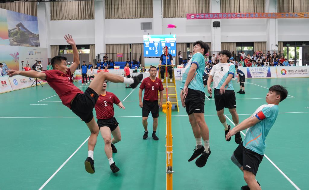 11月24日,第十二屆全國少數民族傳統(tǒng)體育運動會毽球男子三人小組賽在海南省三亞市舉行,圖為天津隊和廣西隊比賽現場。新華社記者 晉美多吉 攝