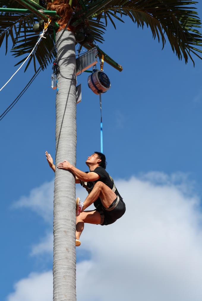 這項(xiàng)起源于海南群眾摘椰勞作的比賽既像沒有巖點(diǎn)的速度攀巖,又像垂直騰躍的跑酷。比賽中,運(yùn)動員在9米(女子7米)的人造椰樹上攀爬,“樹干”筆直,六七秒之間便已決出勝負(fù),扣人心弦的比賽令觀眾發(fā)出潮水般的歡呼。