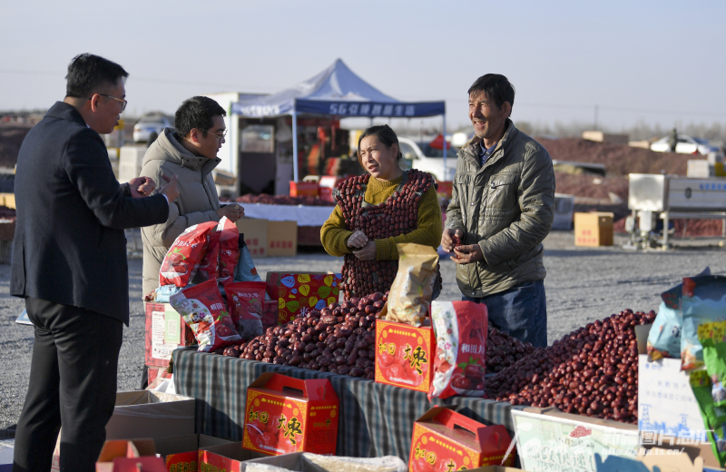 11月29日,策勒縣智慧果業農民專業合作社員工在直播銷售大棗。