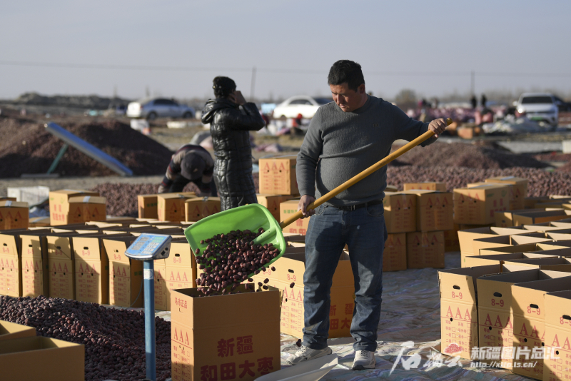 11月29日,農民在晾曬場將晾曬好的紅棗裝箱。