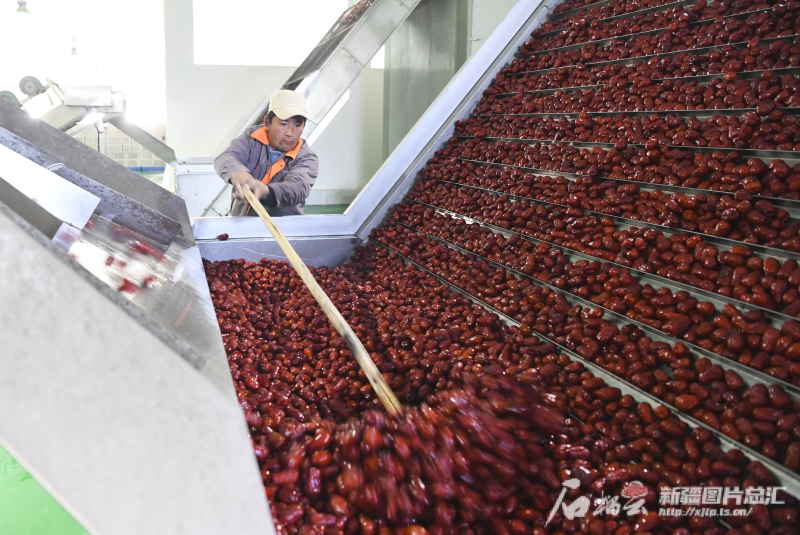11月29日,策勒縣智慧果業農民專業合作社員工在查看紅棗烘干情況。