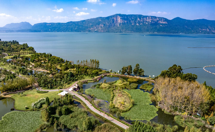 這是2024年10月18日拍攝的云南省昆明市滇池及星海半島濕地公園(無人機照片)。新華社記者 陳欣波 攝