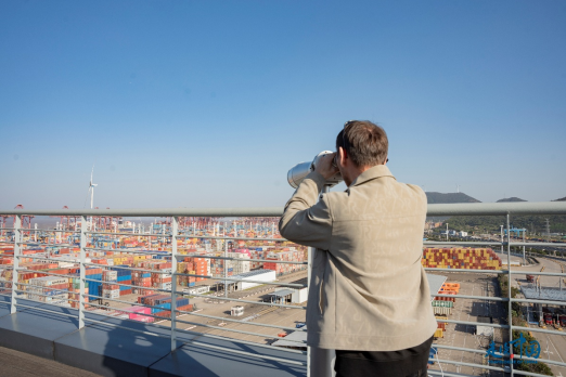 記者們站在觀景平臺,通過望遠鏡親眼見證了全球最繁忙集裝箱港口之一的現代化作業,他們爭相與壯觀的碼頭場景合影留念。來自哈薩克斯坦《誠實報》社會文化部主任納烏雷茲別克·薩爾沙耶夫在接受環球網記者采訪時說道“寧波舟山港的運作效率和智能化管理令人贊嘆,它無疑是全球物流行業的標桿。”