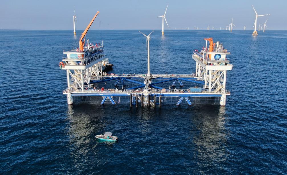 這是中廣核“伏羲一號”風漁融合網箱平臺(無人機照片)。新華社記者鄧華 攝