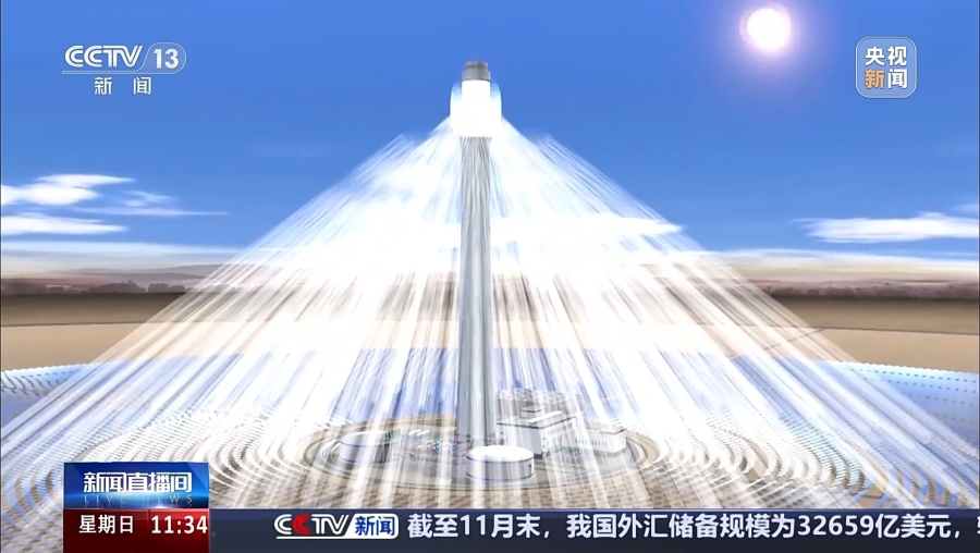 在戈壁荒漠中,這些“向日葵”如何能夠發電?其中有一個聳立的高塔,叫做吸熱塔。塔高達180米,相當于一個60層高的住宅樓。塔內管道里面裝的是熔鹽的液體,一共有兩萬一千多噸。這一萬多朵“向日葵”鏡子和這些熔鹽要在陽光的作用下發生一段奇妙的反應,最終產生電。而最為奇特的是,這些電并不僅僅是在白天產生,還可以在夜晚發出。