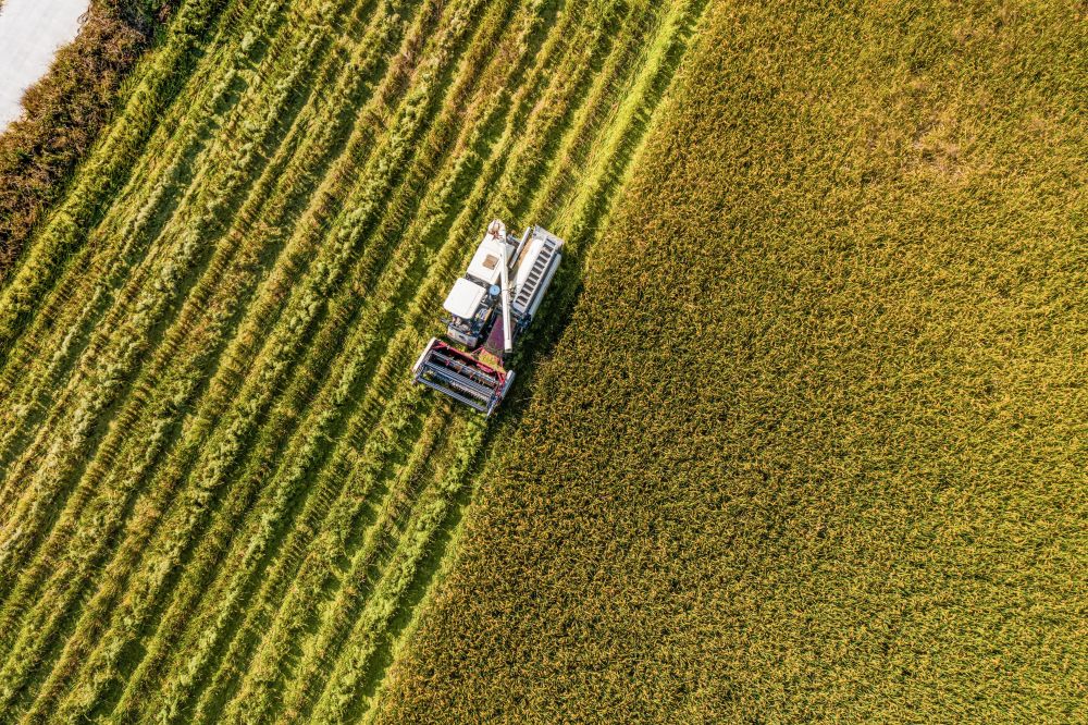 2024年10月25日,收割機在浙江省湖州市吳興區東林鎮保國村的稻田里作業(無人機照片)。新華社記者 徐昱 攝