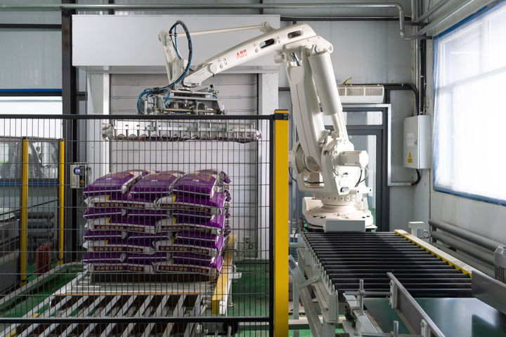 2024年3月29日,黑龍江省黑河市五大連池市一家農業科技企業的機械臂在車間內碼放包裝好的大豆種子。新華社記者 謝劍飛 攝