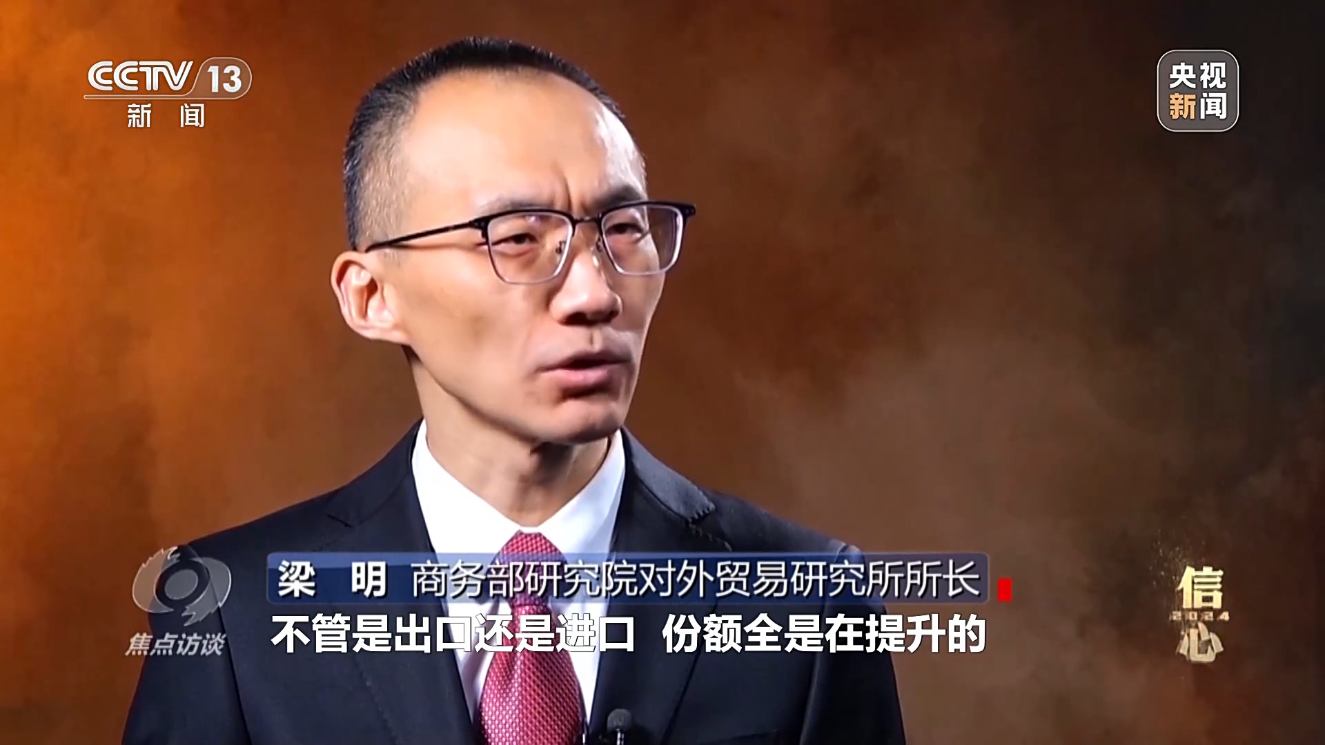 商務(wù)部研究院對(duì)外貿(mào)易研究所所長(zhǎng) 梁明:“今年前三月,中國(guó)出口同比增速4.7%。前11月,增速達(dá)到了6.7%,在逐漸回穩(wěn)向好。不管是出口還是進(jìn)口,份額全是在提升的,顯示了中國(guó)貿(mào)易在全球中的地位進(jìn)一步凸顯,貿(mào)易的質(zhì)量,還有貿(mào)易的結(jié)構(gòu)在逐步優(yōu)化。”