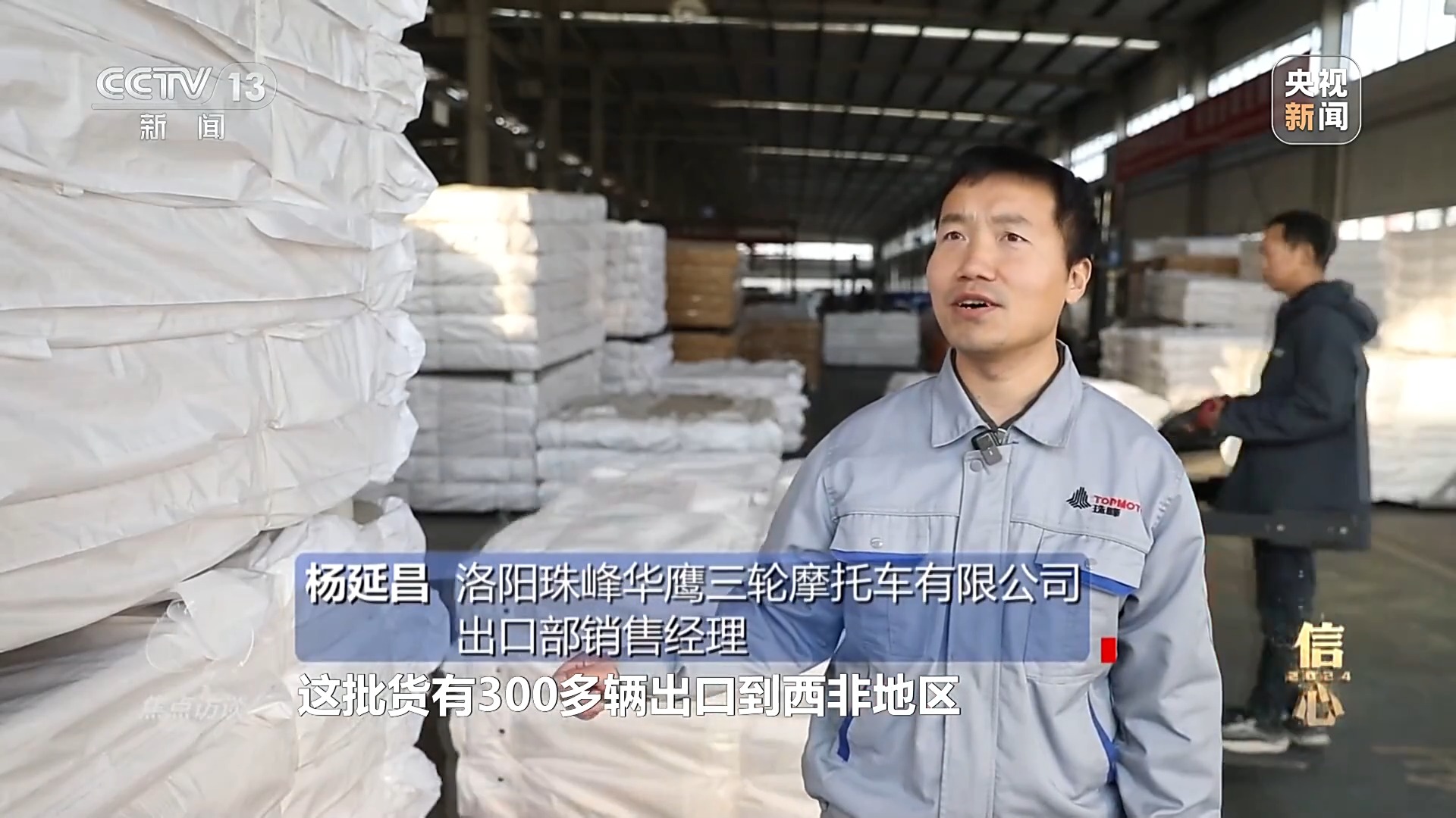 洛陽(yáng)珠峰華鷹三輪摩托車有限公司出口部銷售經(jīng)理 楊延昌:“這批貨有300多輛出口到西非地區(qū),目前訂單量已經(jīng)達(dá)到了3萬(wàn)臺(tái),排到了25年3月份。”