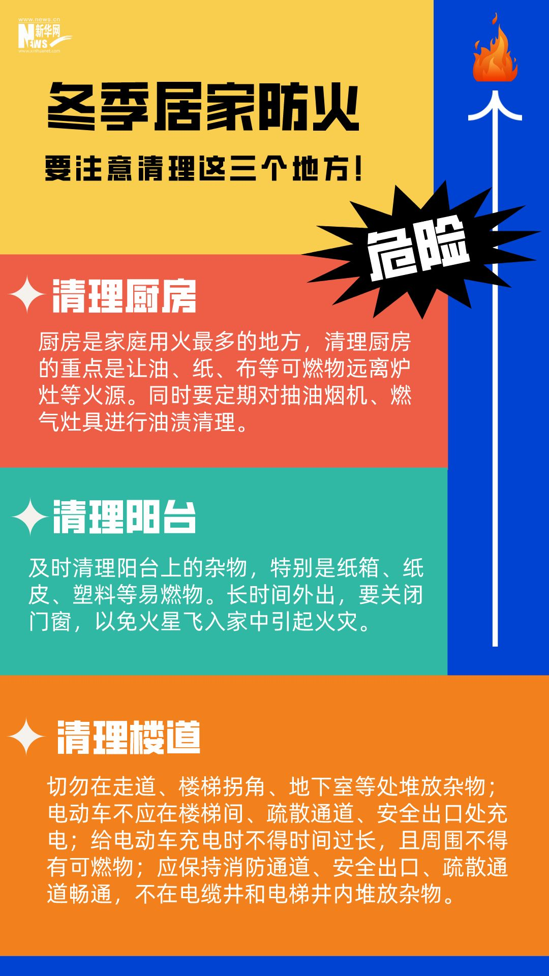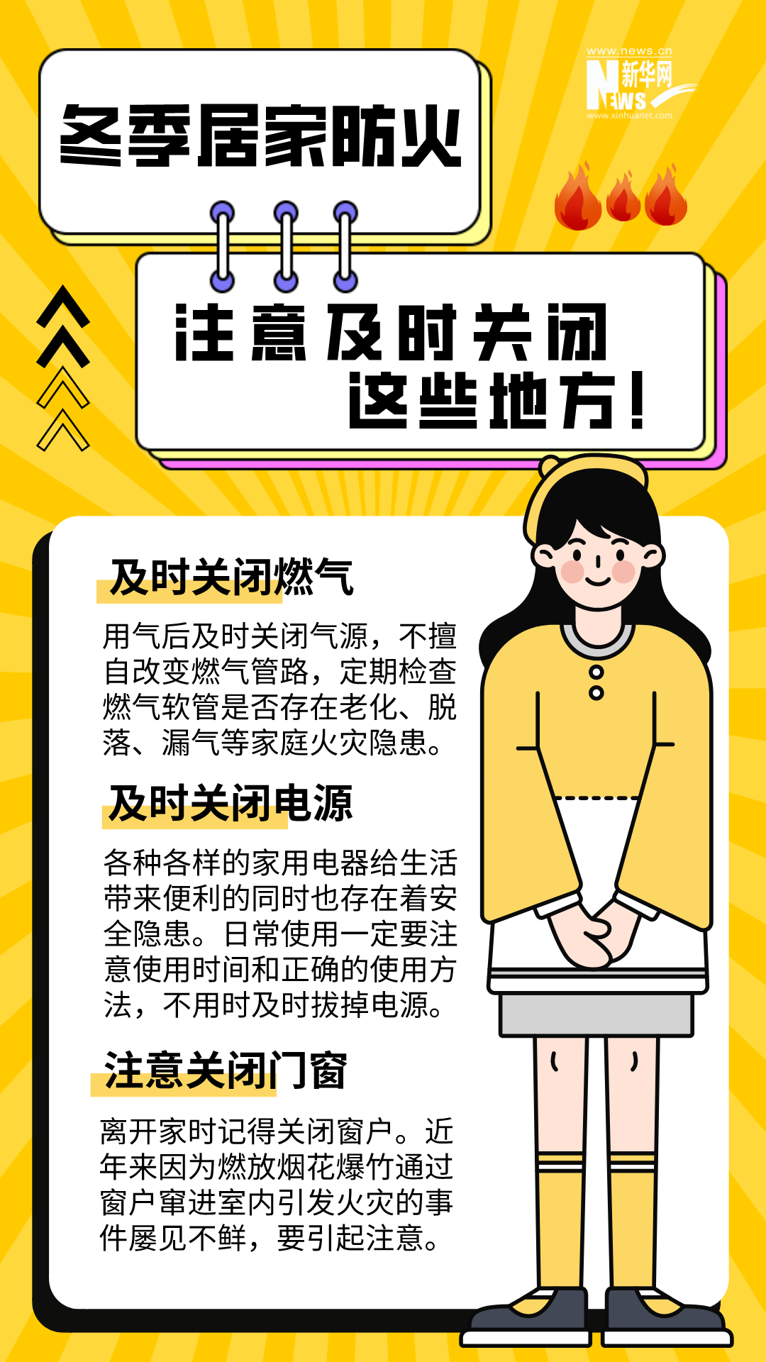 男子在家中用火盆取暖時,不慎引燃身上衣物;女子在電暖器上晾衣服引發火災;母子二人因在家中燒煤取暖、通風不暢導致一氧化碳中毒......冬季天氣寒冷干燥,晝夜溫差大,生活用火、用氣、用電增加。若疏忽大意,極易引發火災。安全過冬,居家防火這些細節要注意。