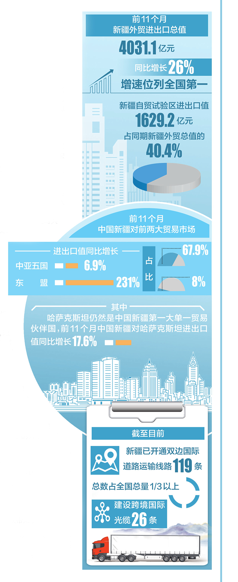 新疆自貿(mào)試驗(yàn)區(qū)賦能效應(yīng)持續(xù)顯現(xiàn)。烏魯木齊海關(guān)數(shù)據(jù)顯示,前11個(gè)月,新疆自貿(mào)試驗(yàn)區(qū)進(jìn)出口值1629.2億元,占同期新疆外貿(mào)總值的40.4%。