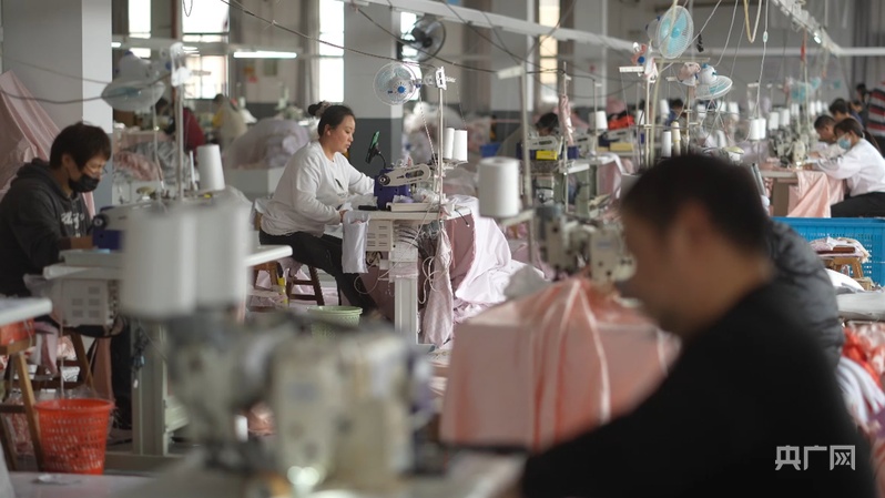 家紡企業車間里,工人在生產線上忙碌(央廣網記者 楊夢奎 攝)