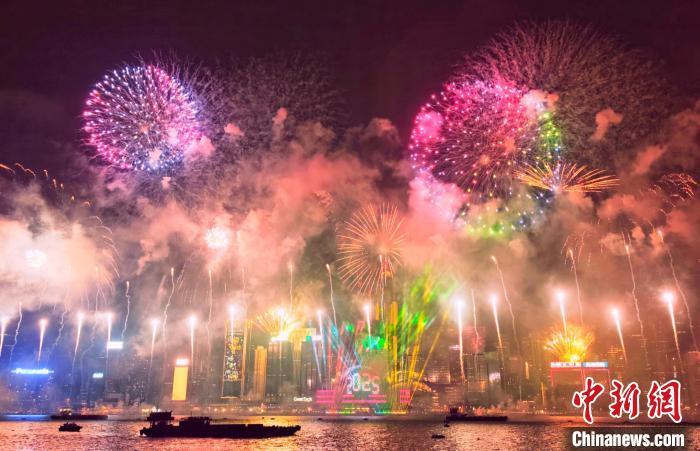 “5、4、3、2、1,新年快樂。”伴隨著尖沙咀鐘樓敲響新年鐘聲,從5艘躉船、16艘浮船上燃放的煙花在空中綻放,點亮自北角至中環約1300米的夜空,煙花、音樂、燈光表演與維港夜景相映成趣,成為夜空中絢爛圖畫。