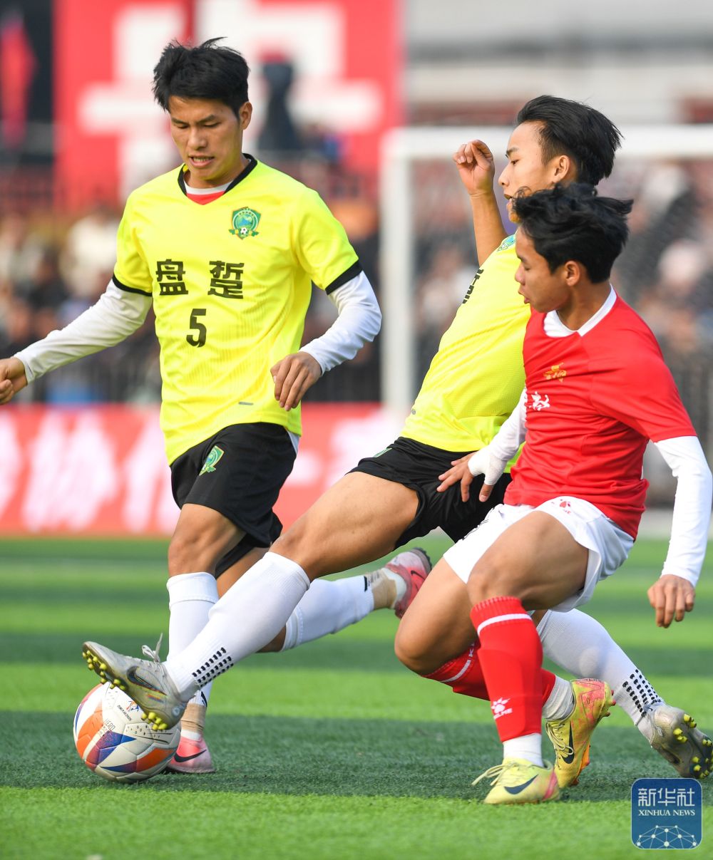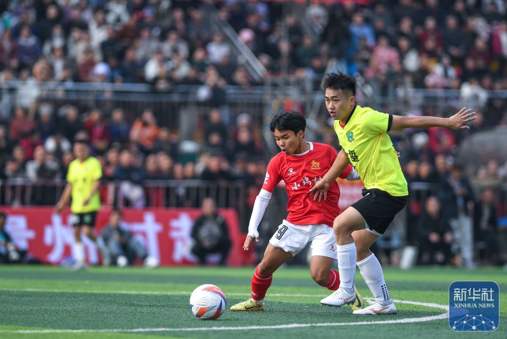 ↑小瑞村足球隊球員石龍(左)與盤踅村足球隊球員在揭幕戰(zhàn)比賽中。