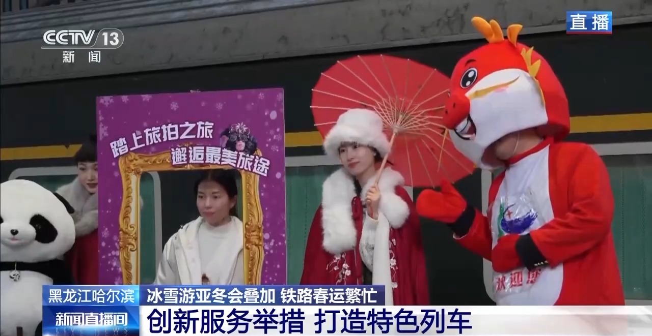 在春運期間,鐵路部門還打造了特色主題列車,比如現(xiàn)在已經(jīng)開通的“旅拍列車”。車上設置了哈爾濱街景、民俗文化、冰雪奇遇等主題場景,車上還有化妝間、更衣室,可以為旅客提供多種風格的旅拍服飾,旅客可以通過手機小程序進行預約。拍攝人員也是由愛好攝影的鐵路職工組成的旅拍團隊,大家都是利用業(yè)余時間為旅客免費提供服務。