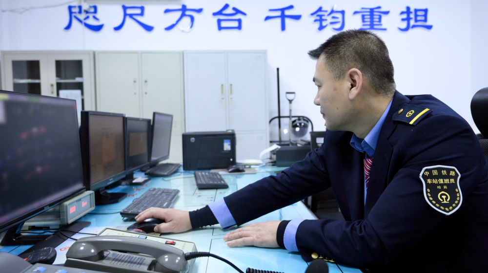 一間不大的值班室,除了床就是操作臺,“咫尺方臺 千鈞重擔(dān)”的條幅下,田春緊盯顯示屏。他負責(zé)運輸組織調(diào)度,是車站“最重要”的崗位。