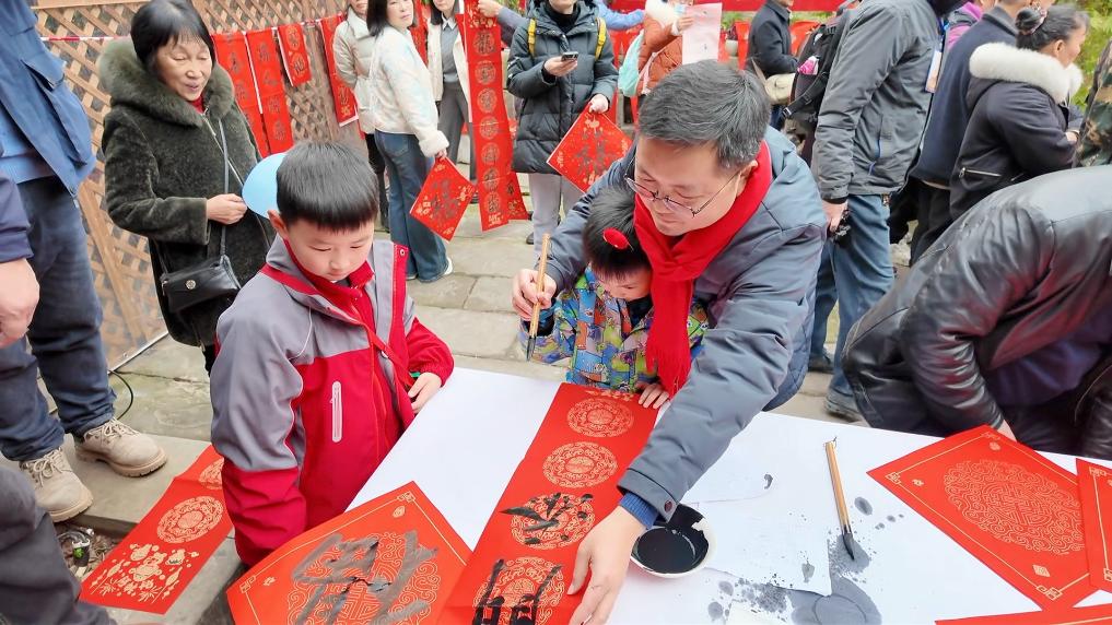 在當日的非遺巡游環節,鯉魚燈、舞龍舞獅、雜耍、川劇變臉吐火、塘河鎮婚俗嗩吶、狀元巡街、財神送福等精彩節目接連上演,吸引眾多游客駐足拍照;在非遺文化體驗互動區,書法家們揮毫潑墨,將書法藝術、民俗文化融為一體,創作出一幅幅作品,游客們排起長隊,依次領取“新年祝福”。