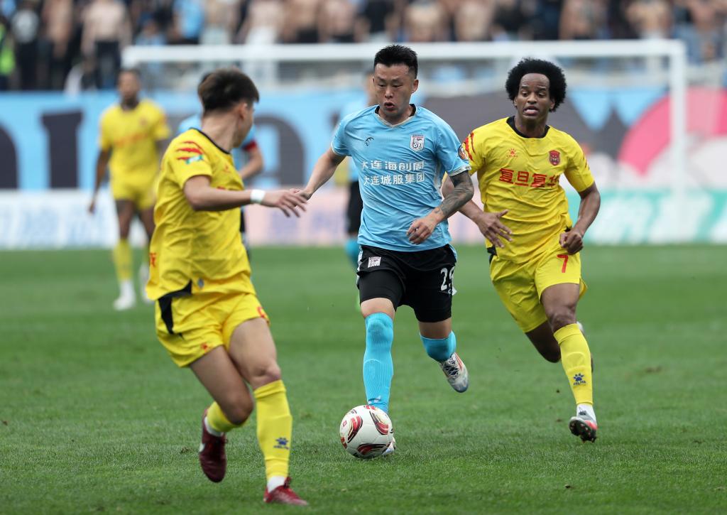 11月3日,大連英博隊球員孫鉑(中)在比賽中突破。當日,在大連舉行的中甲聯賽第30輪比賽中,大連英博隊主場戰勝上海嘉定匯龍隊,從而以中甲聯賽第二名的成績獲得下賽季中超聯賽參賽席位。新華社記者 李鋼 攝