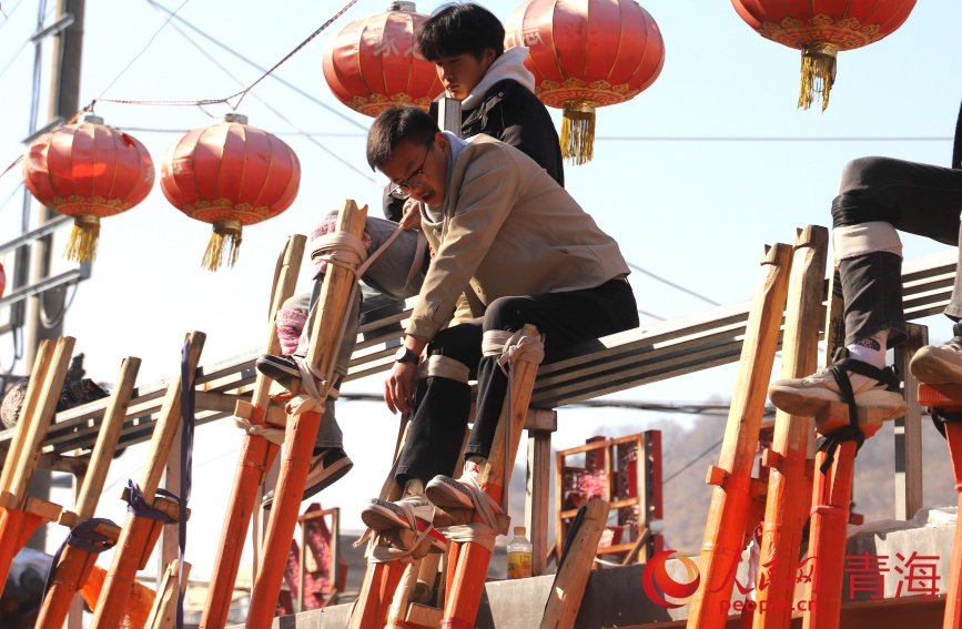 年輕人加入社火高蹺排練。人民網記者 甘海瓊攝