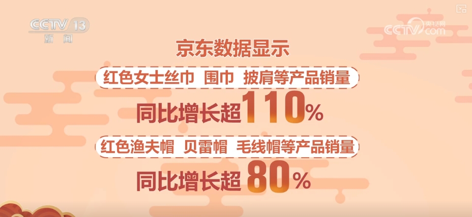 不僅是新年“戰袍”,新年配飾也要配齊。京東數據顯示,2025年,紅色的毛衣鏈銷量同比增長超七倍,紅色手鏈、腳鏈、戒指銷量同比增長超100%。也有很多用戶選擇用紅色帽子、圍巾來增添節日氛圍,紅色女士絲巾、圍巾、披肩等產品銷量同比增長超110%,紅色漁夫帽、貝雷帽、毛線帽等產品銷量同比增長也超過了80%。