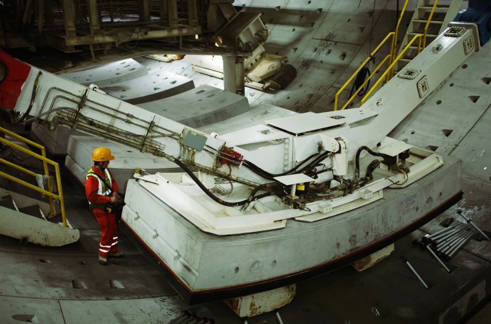 點點“星光”盡頭,拼裝班長周洪強操作伸縮機,將一塊隧道管片緩緩抓起。穩穩平移、旋轉過后,12噸重的管片精準落位。