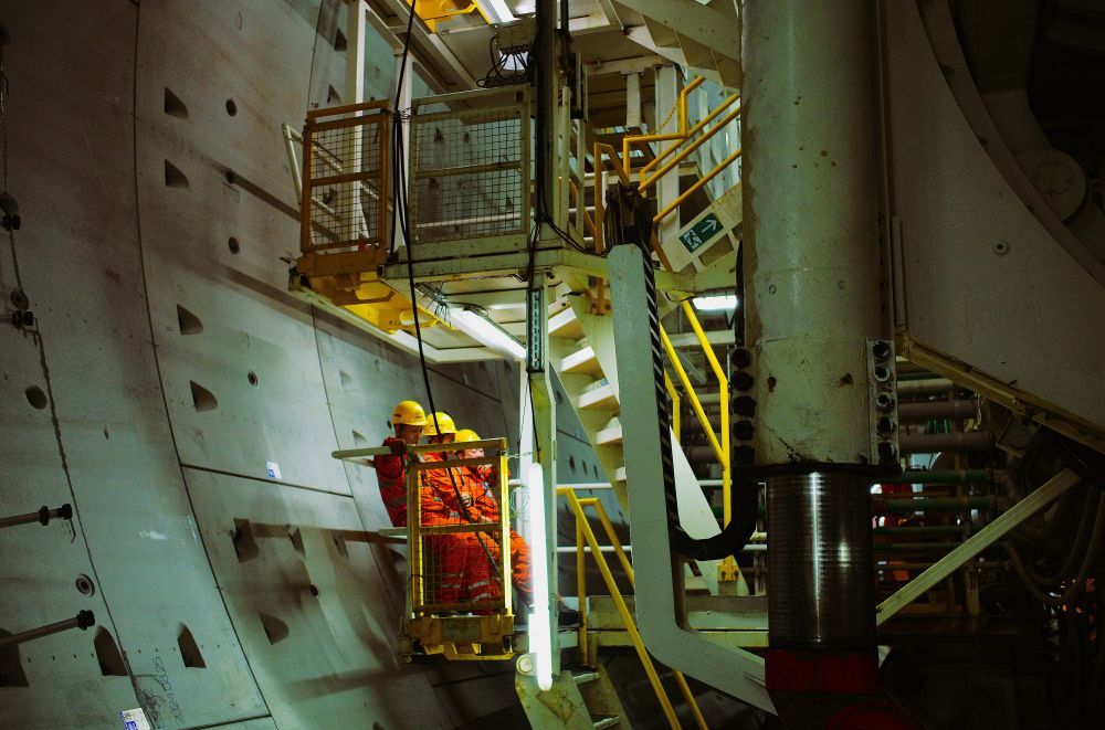 向隧道深處走去,正在作業的“山河號”盾構機出現在記者眼前。作為在建世界最大直徑水下盾構隧道的掘進機械,開挖直徑達到17.5米的“山河號”盾構機是世界在建最大直徑泥水平衡盾構機。