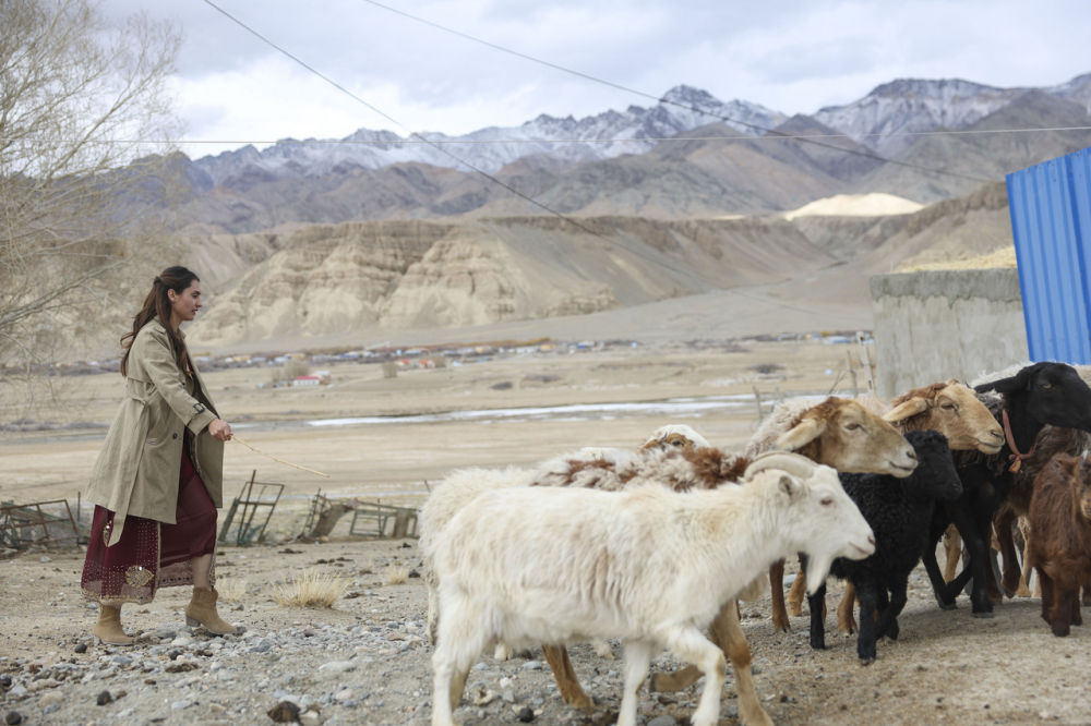 在瓦恰鄉(xiāng)夏布孜喀拉村,艾爾開牙·多力開幫忙將羊群趕回羊圈(2024年3月22日攝)。