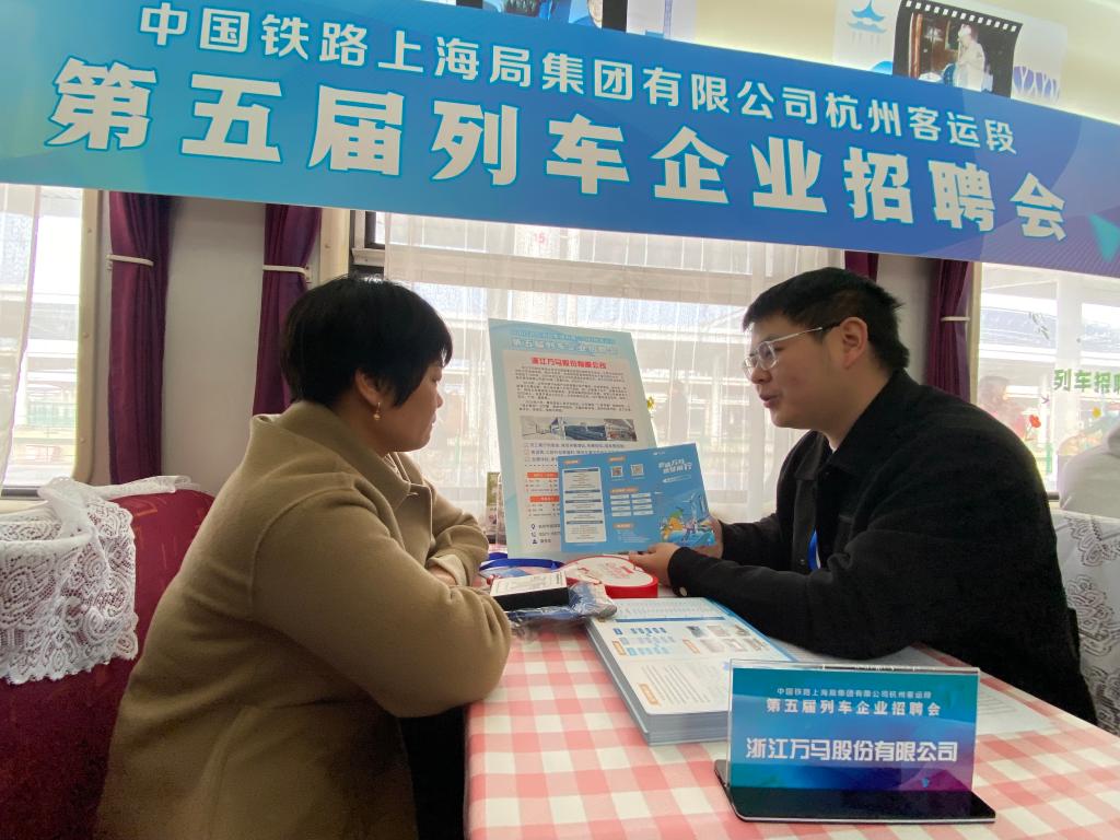 杭州客運段甬廣車隊黨總支書記朱秦予介紹,當天除了在K210次列車設置企業一對一招聘臺,列車工作人員還通過網絡直播,在西安開往寧波的K468次、蘭州開往杭州的T114次等列車上同步開展線上招聘會,為更多旅客提供崗位選擇。