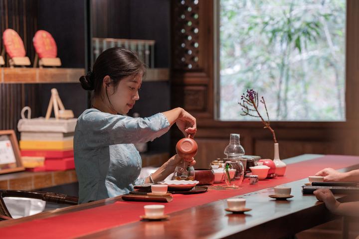 在景邁山布朗公主茶廠,布朗族姑娘葉香在給顧客泡茶。新華社記者 胡超 攝