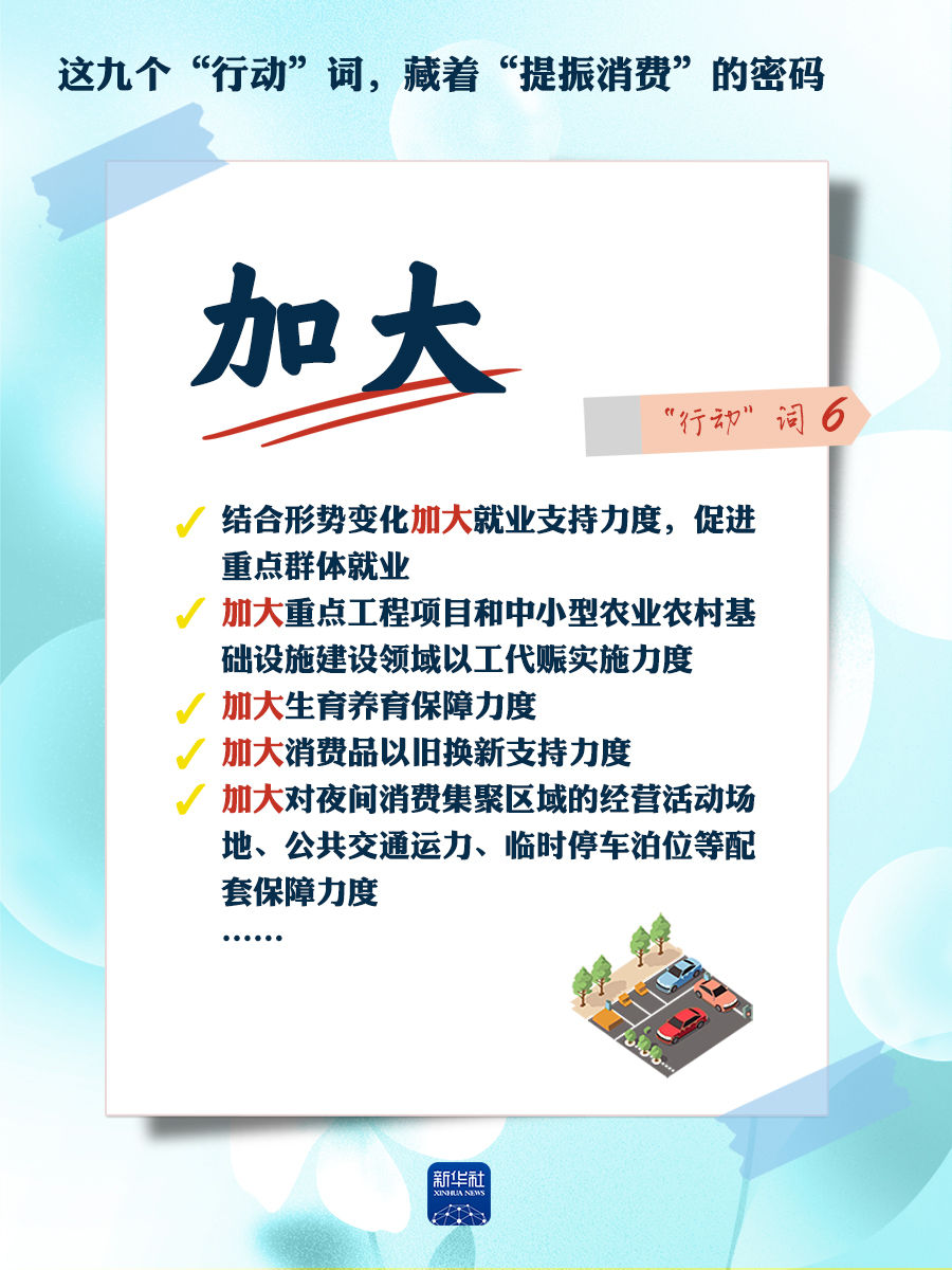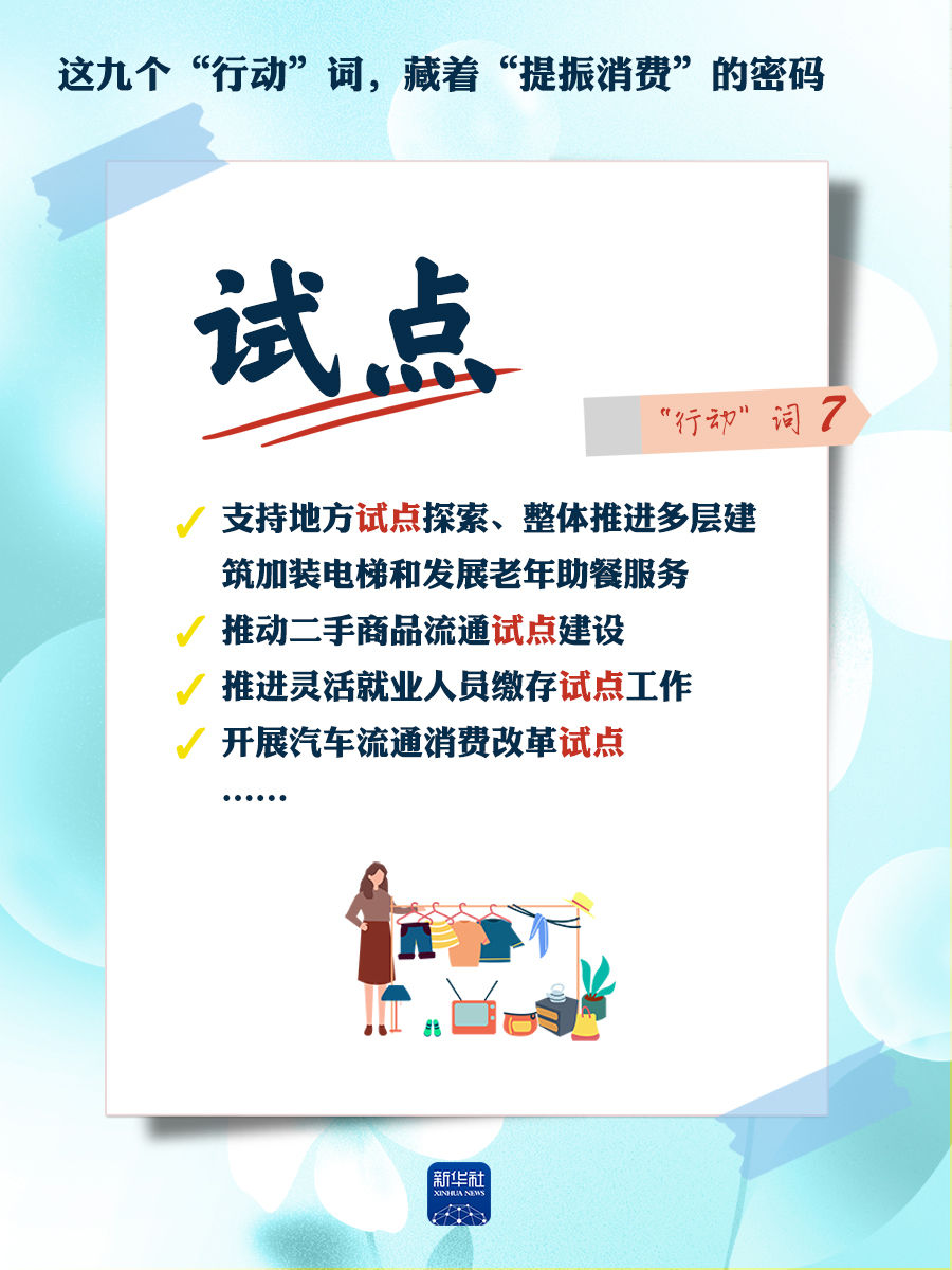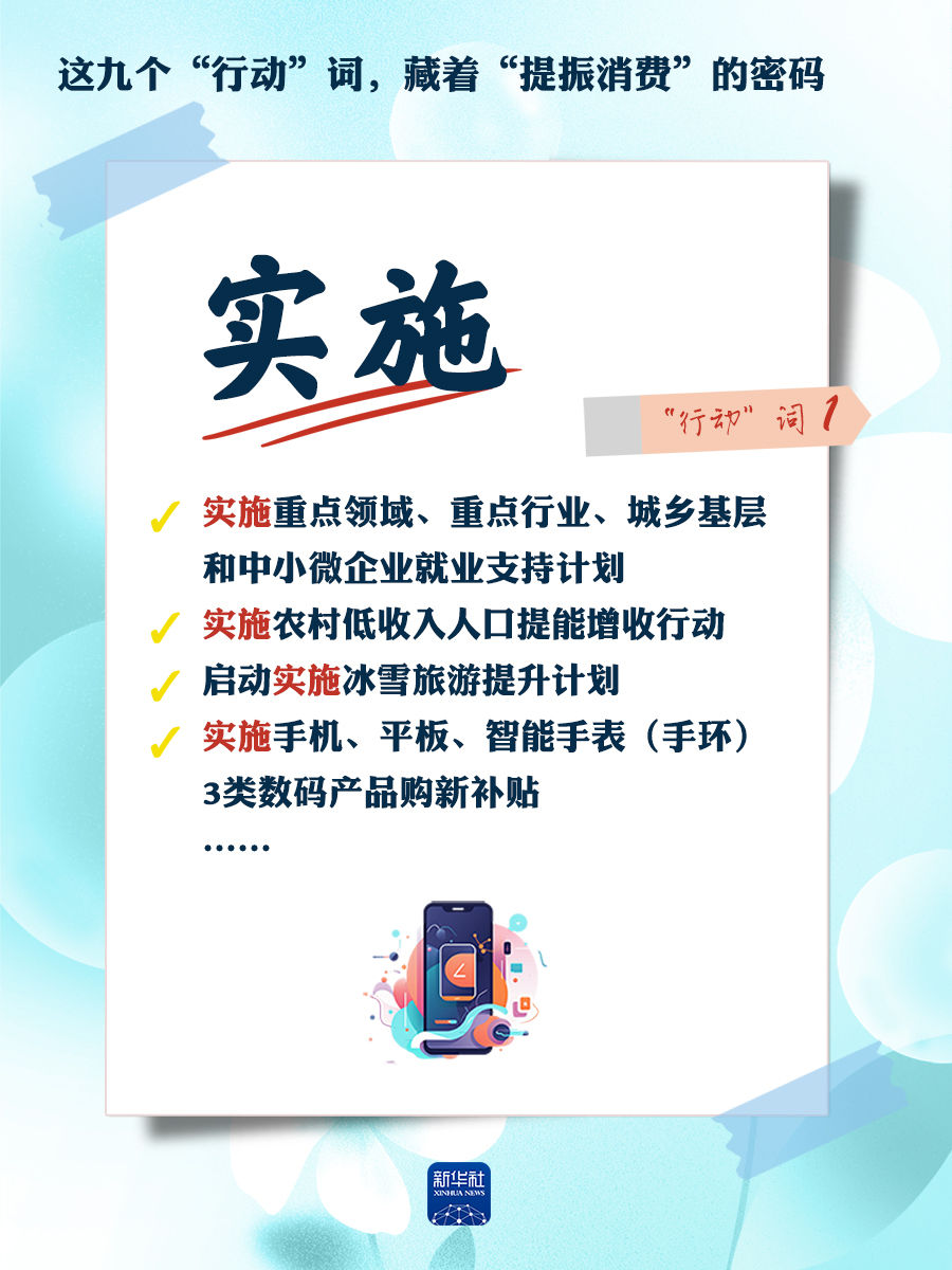 我們梳理出“方案”中使用頻率較高的九個“行動”詞,從這些不同維度的“行動”詞中,解讀“專項行動”的豐富內涵和政策“含金量”,看看哪些是立竿見影、吹糠見米的惠民行動?哪些是需要加力擴圍、加快補齊的消費短板?還有哪些是需要有序推進、以點帶面的消費“新”點?