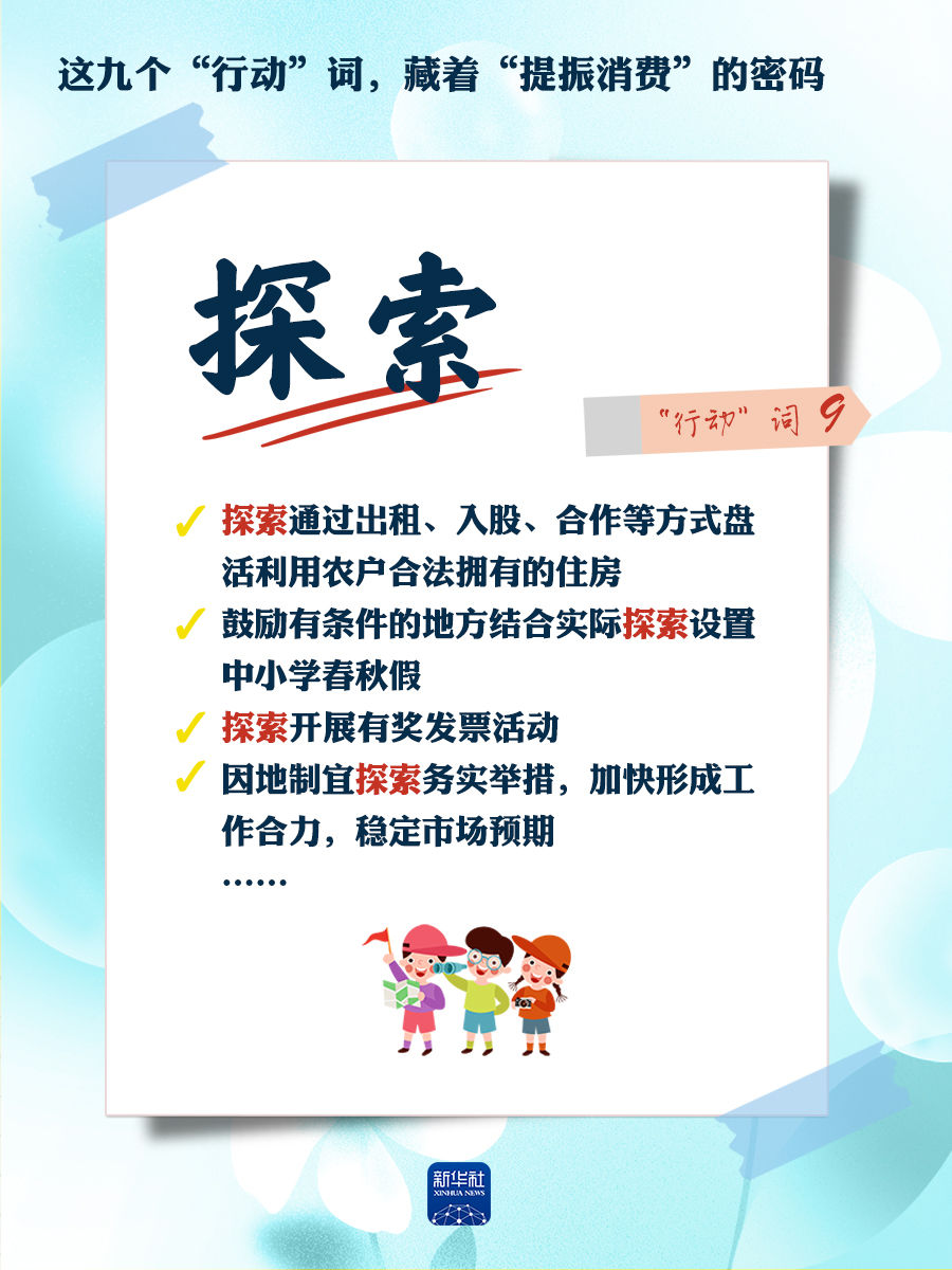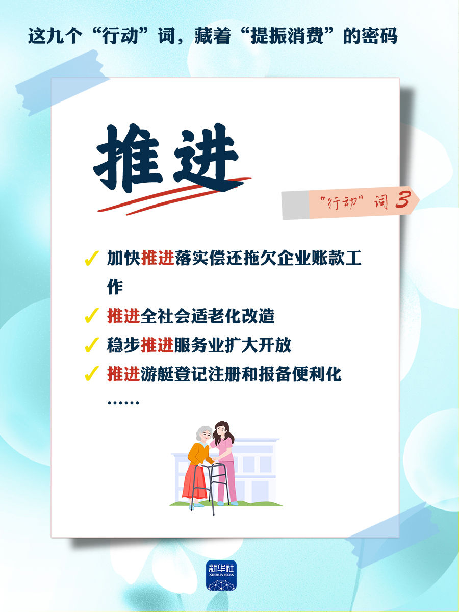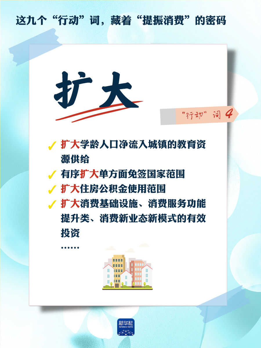 我們梳理出“方案”中使用頻率較高的九個“行動”詞,從這些不同維度的“行動”詞中,解讀“專項行動”的豐富內涵和政策“含金量”,看看哪些是立竿見影、吹糠見米的惠民行動?哪些是需要加力擴圍、加快補齊的消費短板?還有哪些是需要有序推進、以點帶面的消費“新”點?