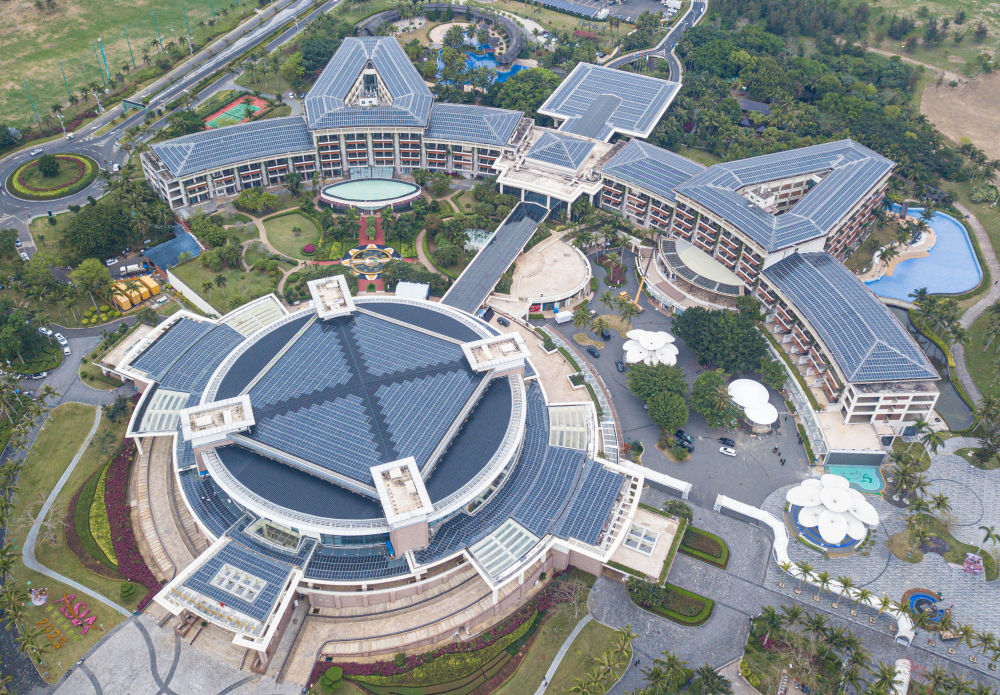 這是在博鰲零碳示范區拍攝的博鰲亞洲論壇新聞中心及配樓屋頂的光伏設備(無人機照片,3月16日攝)。