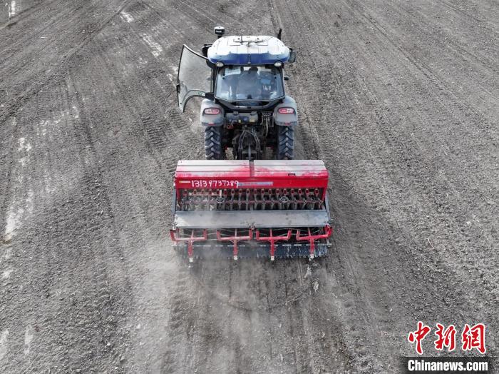 新疆巴音郭楞蒙古自治州庫爾勒市,搭載北斗導航系統的播種機在田間有序作業。確·胡熱 攝