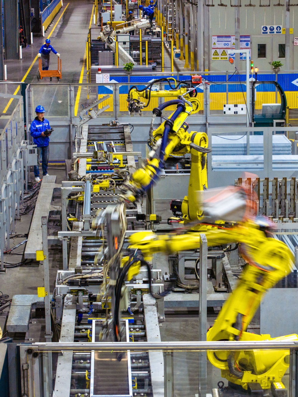 3月29日,浙江省寧波宏大電梯有限公司的工人在生產線上忙碌(無人機照片)。