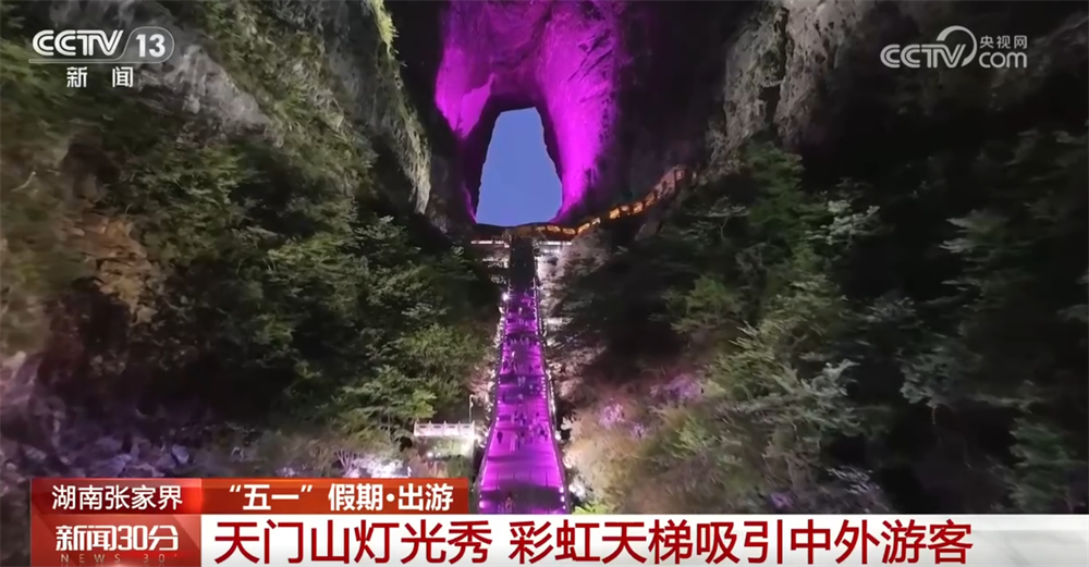 “五一”假期,湖南天門山景區以自然風光吸引中外游客。隨著夜幕降臨,天門山山體被五彩燈光點亮,999級彩虹臺階燈光流轉,遠看就像一道連通天地的彩虹橋,將千年奇觀天門洞裝點得更加巍峨壯觀。