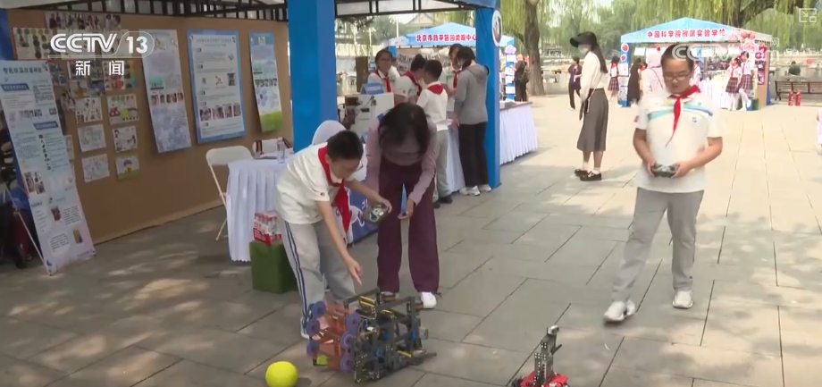“科技強(qiáng)國”小學(xué)生社團(tuán)風(fēng)采展示活動(dòng)也在現(xiàn)場同步開展。來自北京各個(gè)學(xué)校的少先隊(duì)科技社團(tuán)齊聚一堂,孩子們興致盎然地分享自己設(shè)計(jì)拼裝的投球機(jī)器人、巡防機(jī)器人、智能消毒碗柜等精彩紛呈的科技成果。