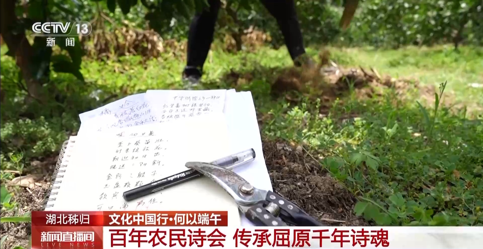 承襲千年詩風,傳承屈原精神,詩社成員不僅吟唱詩歌,還作詩。對于這些農(nóng)民詩人們來說,每天一手鋤頭、一手詩歌,是大家平日的寫照。今年75歲的黃家兆,60歲時加入詩社,并學習作詩。僅靠著老社員的口授,初中文化的他硬是背下了百余個詩詞格律。有時在田間靈感來了,順手撿來的廢紙都可以成為他寫詩的地方。十幾年來,黃家兆共創(chuàng)作了一百二十多首詩歌。田間的橙子,林中的啄木鳥,四季的勞作,豐收的時刻,一首首詩歌記錄著恬靜的歲月,更記錄著為美好生活的奮斗。