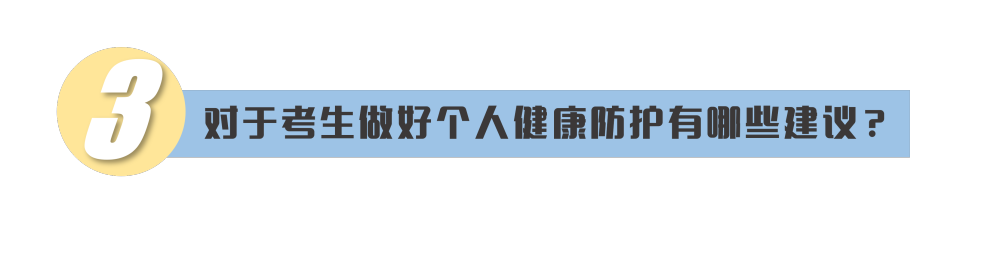 考生要做好個(gè)人防護(hù),當(dāng)好自身健康第一責(zé)任人。考前盡量減少聚集和流動,不去人員密集場所。同時(shí),調(diào)整好心理狀態(tài),保證合理的飲食、充足的睡眠、適當(dāng)?shù)纳眢w鍛煉,如有不適,要及時(shí)就醫(yī)治療,謹(jǐn)防因身體不適而影響考試。對于發(fā)熱或者突發(fā)急病等考生,也不必?fù)?dān)心恐慌,各地考點(diǎn)都制定了相應(yīng)的預(yù)案。