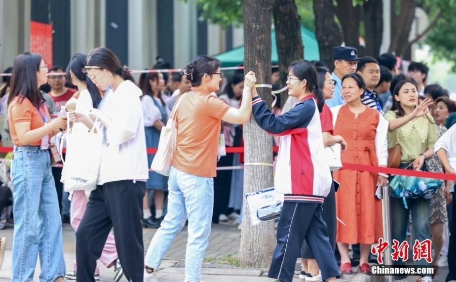 資料圖:2024年6月7日,湖北省武漢市長(zhǎng)虹中學(xué)考點(diǎn),考生入場(chǎng)前與送考老師擊掌。張暢 攝