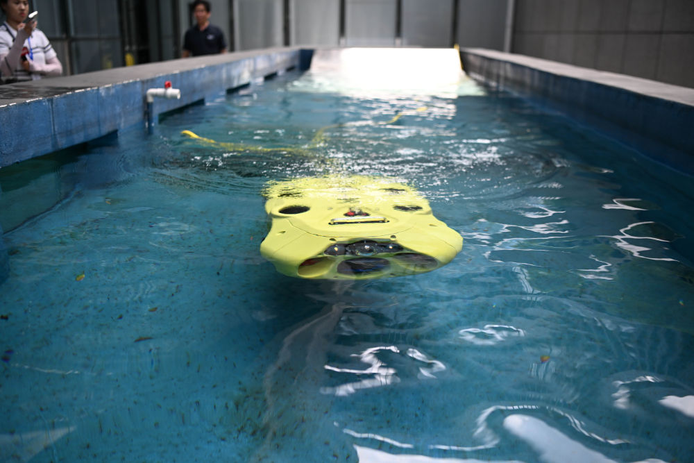 在長方形的測試水池里,一臺明黃色的“鐵疙瘩”時而浮出水面,時而沉入水底,看似笨重的身軀卻靈活得仿佛一條游動的魚。這款用于水下檢測的智能機器人,可以在“一沉一浮”間實現(xiàn)對水下情況全方位、無死角的探測作業(yè)。