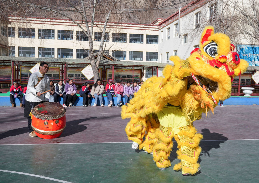 西藏昌都市洛隆縣,舞獅隊(duì)正在表演獅子舞。新華社記者 孫非 攝