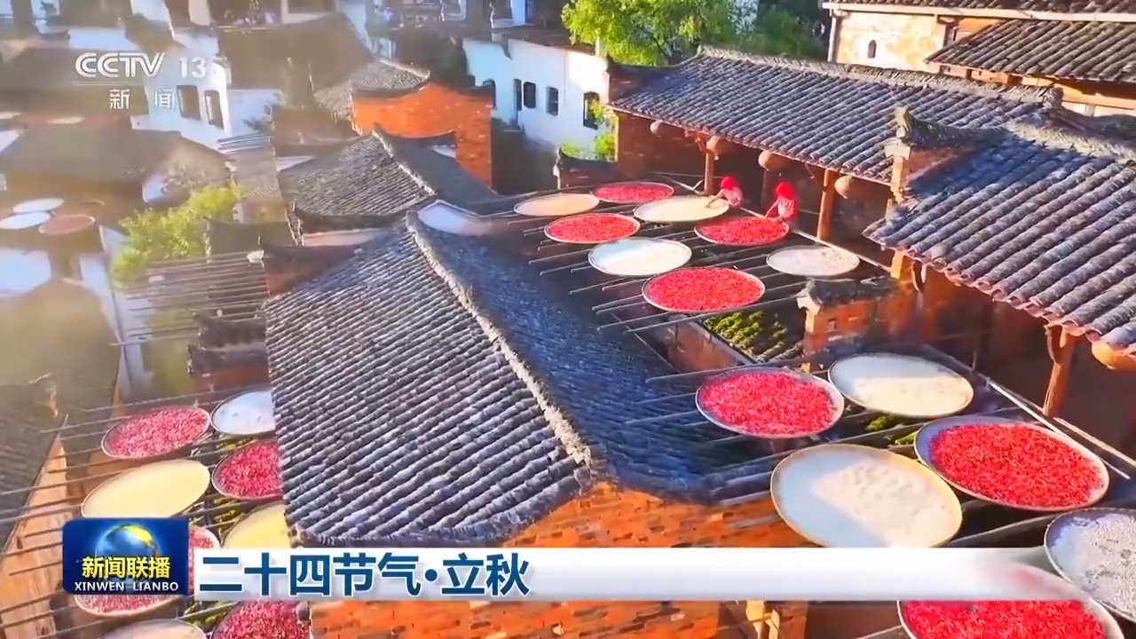 立秋至,曬秋忙。人們利用房前屋后晾曬農作物,色彩斑斕,既是風俗,也是風景。