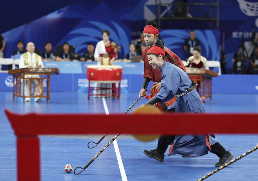 世運(yùn)會(huì)不僅是競技的賽場,更是文明互鑒的窗口。8月6日,軟式曲棍球項(xiàng)目開賽。正式比賽之前,一場別開生面的“比賽”率先上演。循著鼓點(diǎn)、琴聲,演員們身著唐裝球衣競逐竹編彩球,一場金堂非遺步打球表演,將現(xiàn)場觀眾帶回到盛唐場景。