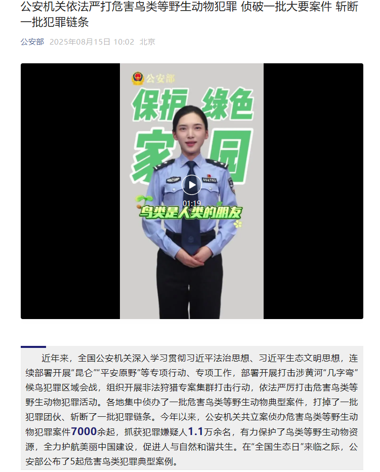 近年來,全國公安機關深入學習貫徹習近平法治思想、習近平生態文明思想,連續部署開展“昆侖”“平安原野”等專項行動、專項工作,部署開展打擊涉黃河“幾字彎”候鳥犯罪區域會戰,組織開展非法狩獵專案集群打擊行動,依法嚴厲打擊危害鳥類等野生動物犯罪活動。各地集中偵辦了一批危害鳥類等野生動物典型案件,打掉了一批犯罪團伙、斬斷了一批犯罪鏈條。今年以來,公安機關共立案偵辦危害鳥類等野生動物犯罪案件7000余起,抓獲犯罪嫌疑人1.1萬余名,有力保護了鳥類等野生動物資源,全力護航美麗中國建設,促進人與自然和諧共生。在“全國生態日”來臨之際,公安部公布了5起危害鳥類犯罪典型案例。