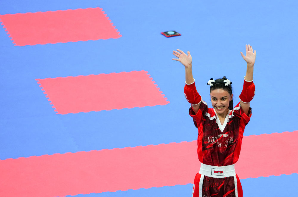 土耳其姑娘克倫奇是重度熊貓愛好者,贏下自由搏擊女子半接觸50公斤級半決賽后,她從容摘下護具,拿出一枚熊貓發卡戴在頭上。而她的背包里,足足塞了13個熊貓紀念品。