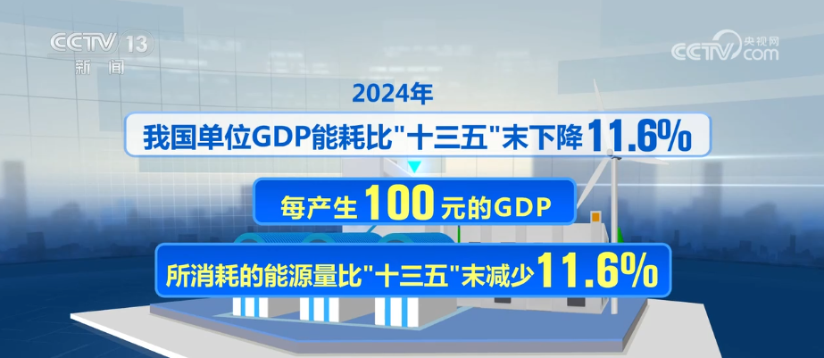 2024年,我國單位GDP能耗比“十三五”末下降11.6%。也就是說每產(chǎn)生100元的GDP,所消耗的能源量比“十三五”末減少了11.6%,能耗下降的同時,另一個指標(biāo)的水平卻提高了——主要資源產(chǎn)出率卻提高了12%。