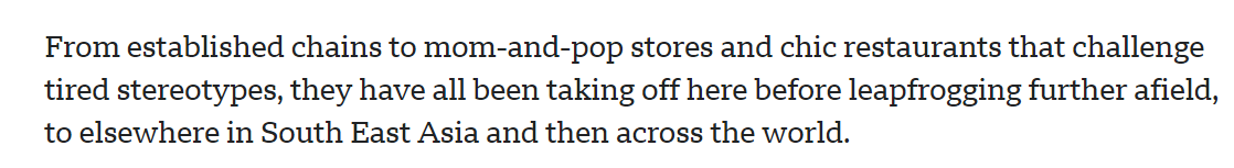 文章說,中國烹飪技藝源遠流長、博大精深,一桌美食盛宴或許正是中國最有效卻又最被低估的吸引力所在。還是以新加坡為例,商場、公交和地鐵站里,搭配著中國成語的中國美食巨幅亮眼廣告不時閃現。從連鎖巨頭到夫妻小店,再到顛覆刻板印象的時尚餐廳,這些中國美食品牌在向東南亞乃至全球擴張前,都已在這個國際旅游城市嶄露頭角。