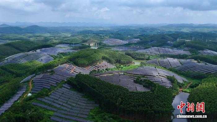 初秋清晨,陽光穿過層疊的光伏板,將廣西崇左市江州鎮板崇村后山的坡地“鍍上”金色,光伏板下卻是一片盎然生機:五指毛桃舒展著“五爪”葉片,空氣中浮動著椰香,天冬、百步從行間探頭,為3722畝的“光伏海洋”繡上綠邊。