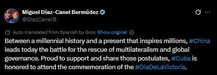 迪亞斯-卡內(nèi)爾在社交媒體上發(fā)文稱,“在綿延千年的歷史與激勵億萬人的當(dāng)下之間,中國今日引領(lǐng)捍衛(wèi)多邊主義與全球治理的斗爭。古巴為支持并踐行這些理念而自豪,并榮幸出席勝利日紀(jì)念活動。”